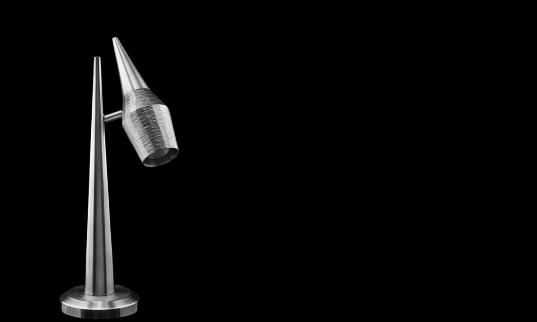 The conical lamp head delivers a focused, directional light, reinforcing the object’s instrumental character. Surface textures and machining marks are left visible, emphasizing material honesty and process. Alien I Desk Lamp operates at the intersection of sculpture and function, designed for environments that value bold restraint, clarity of form, and architectural attitude.
