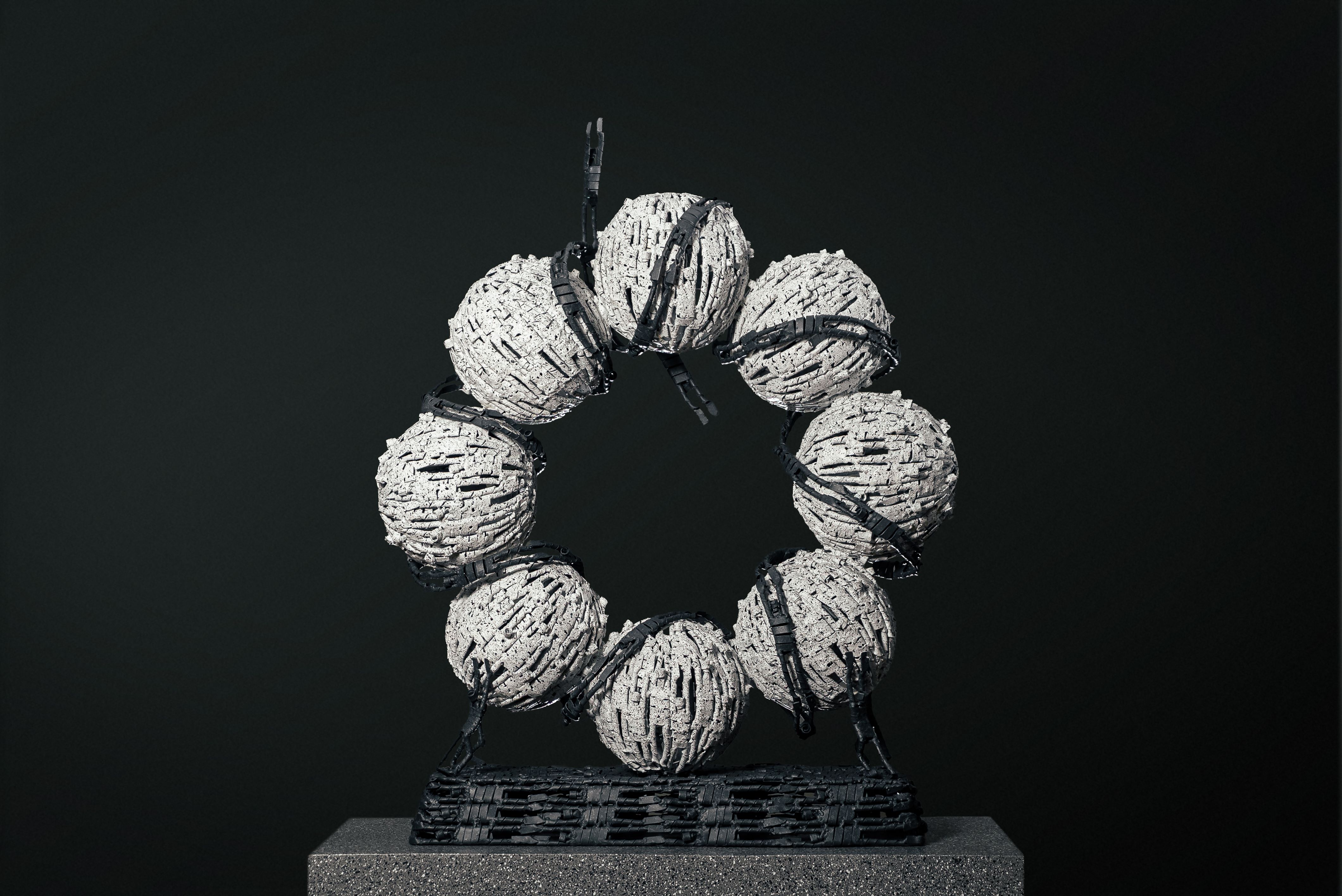 Ball Series – Snow white presents a composition of snow-white spheres arranged in a circular formation, creating a complete ring atop a solid black base. Each sphere is constructed from interconnected small human figures Redy Rahadian’s signature style forming a compact yet dynamic whole.