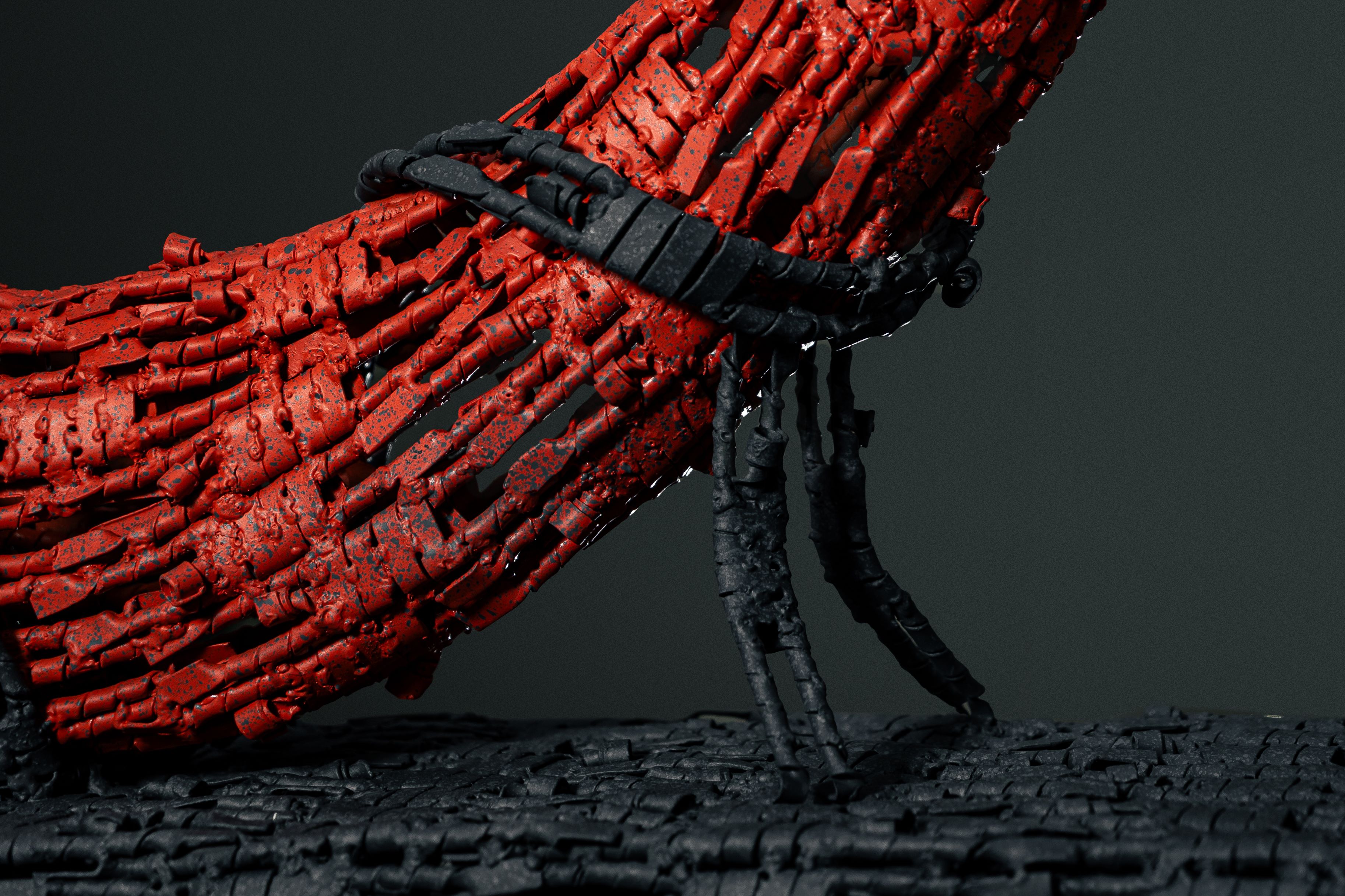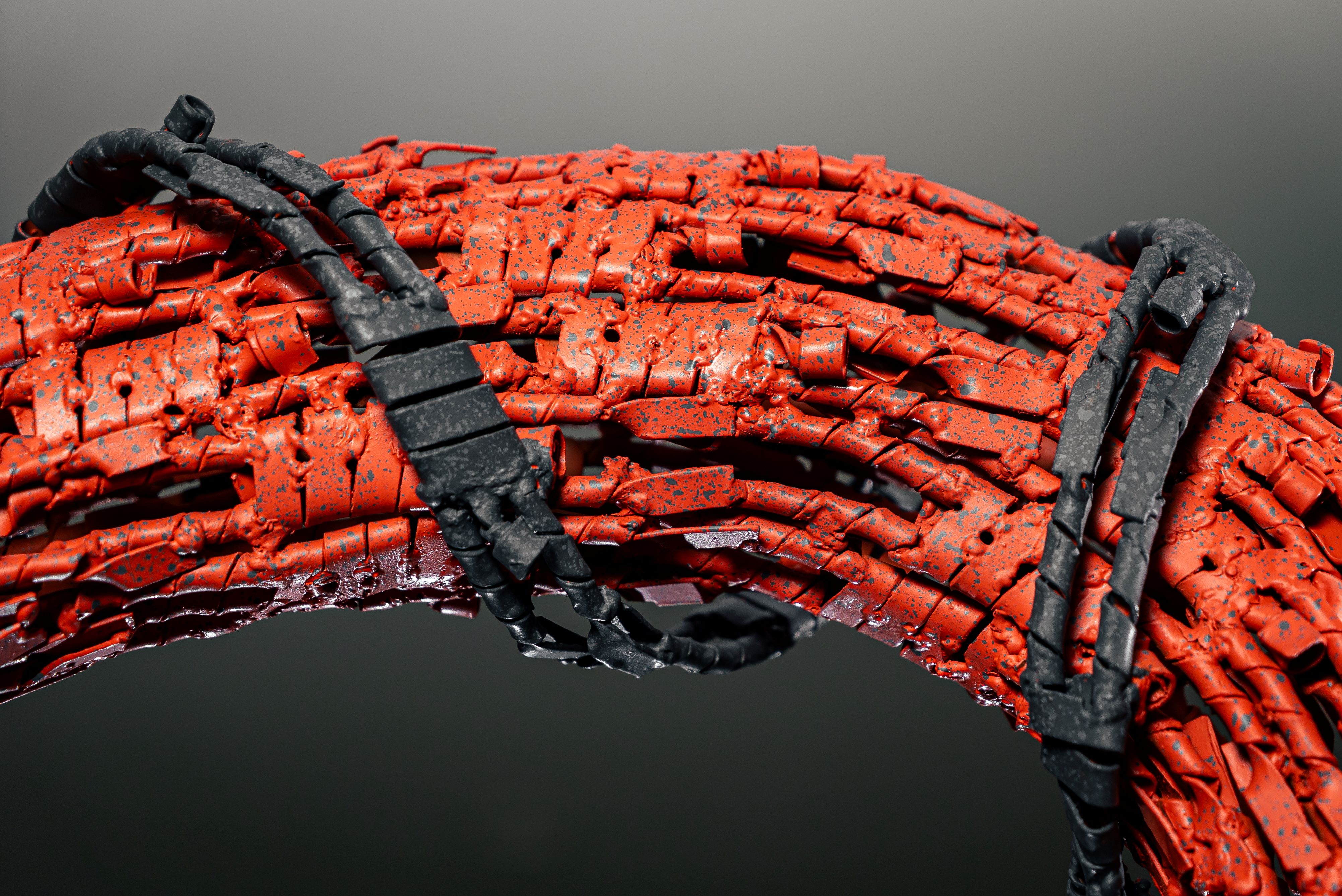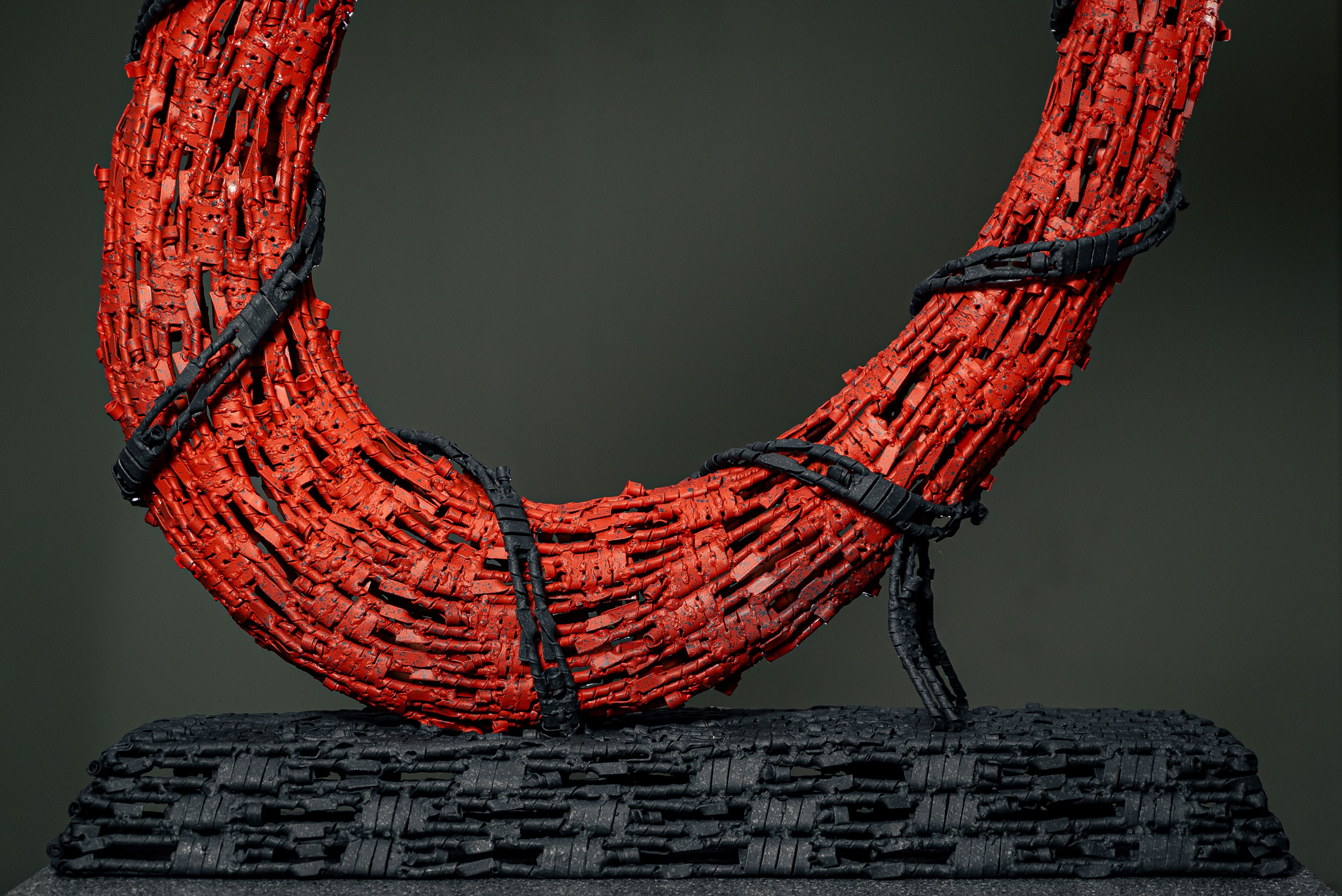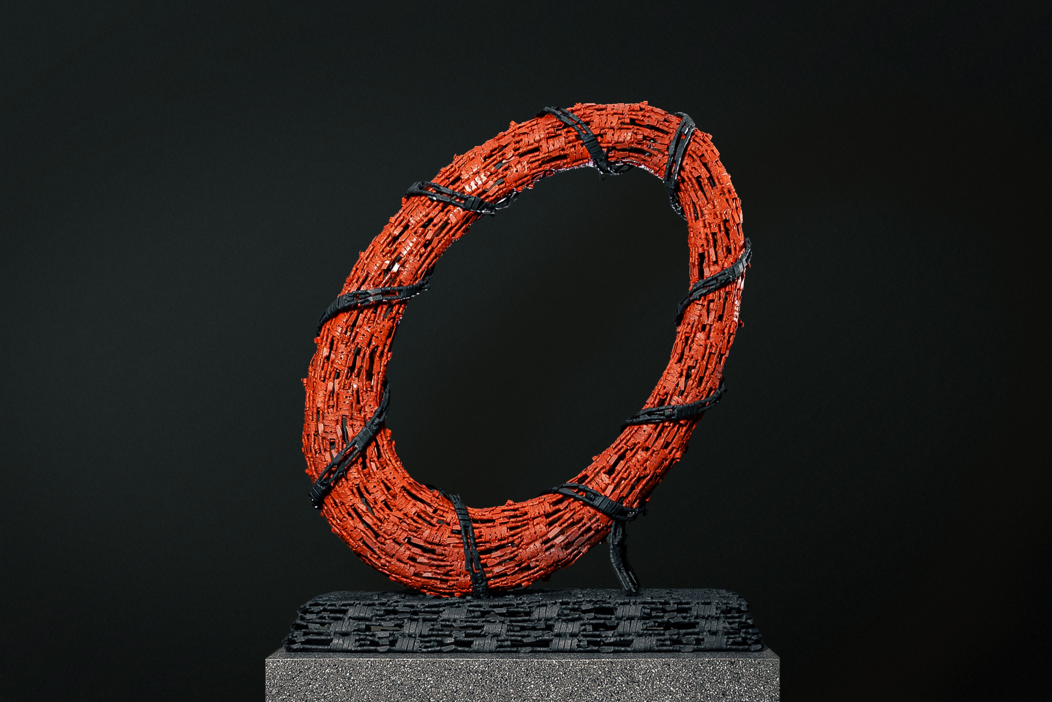 Circle of Life series is an exploration of the circular form, constructed from hundreds of interconnected small human figures a signature of Redy Rahadian. Made of bright orange iron, the circle stands at an angle on a solid black base.