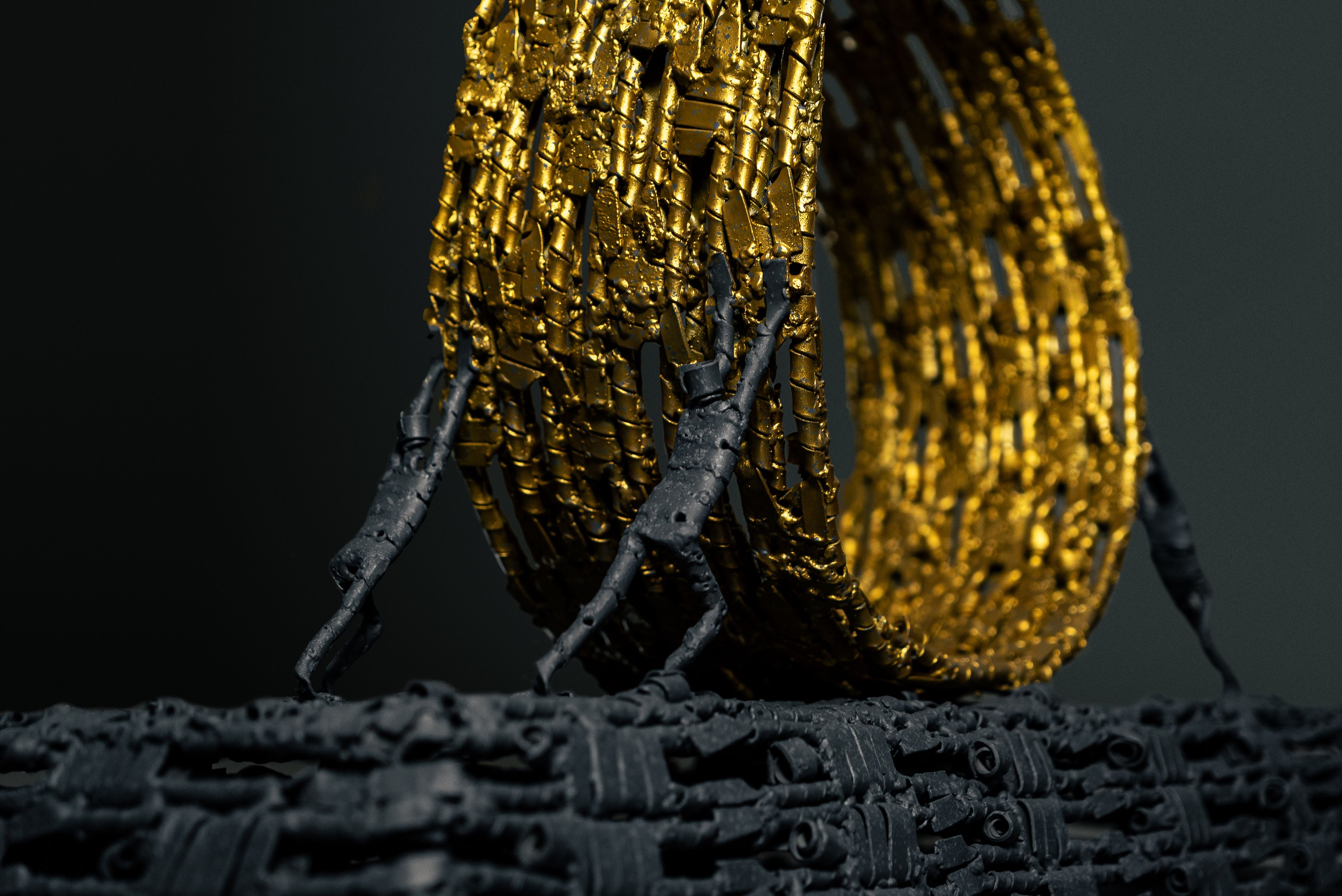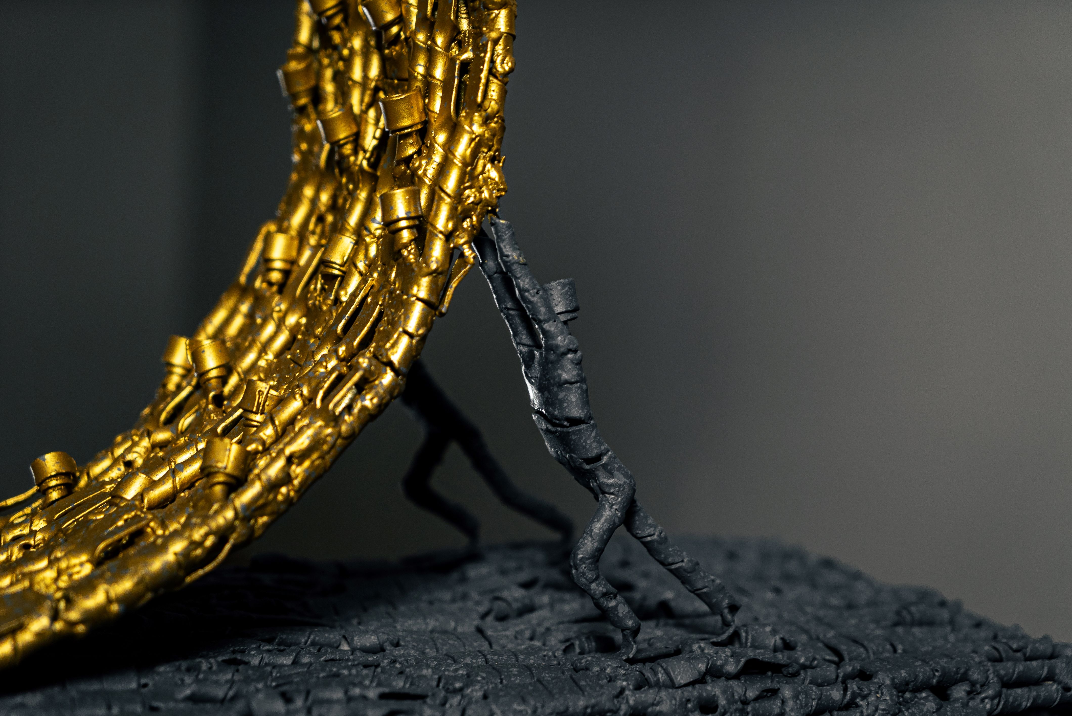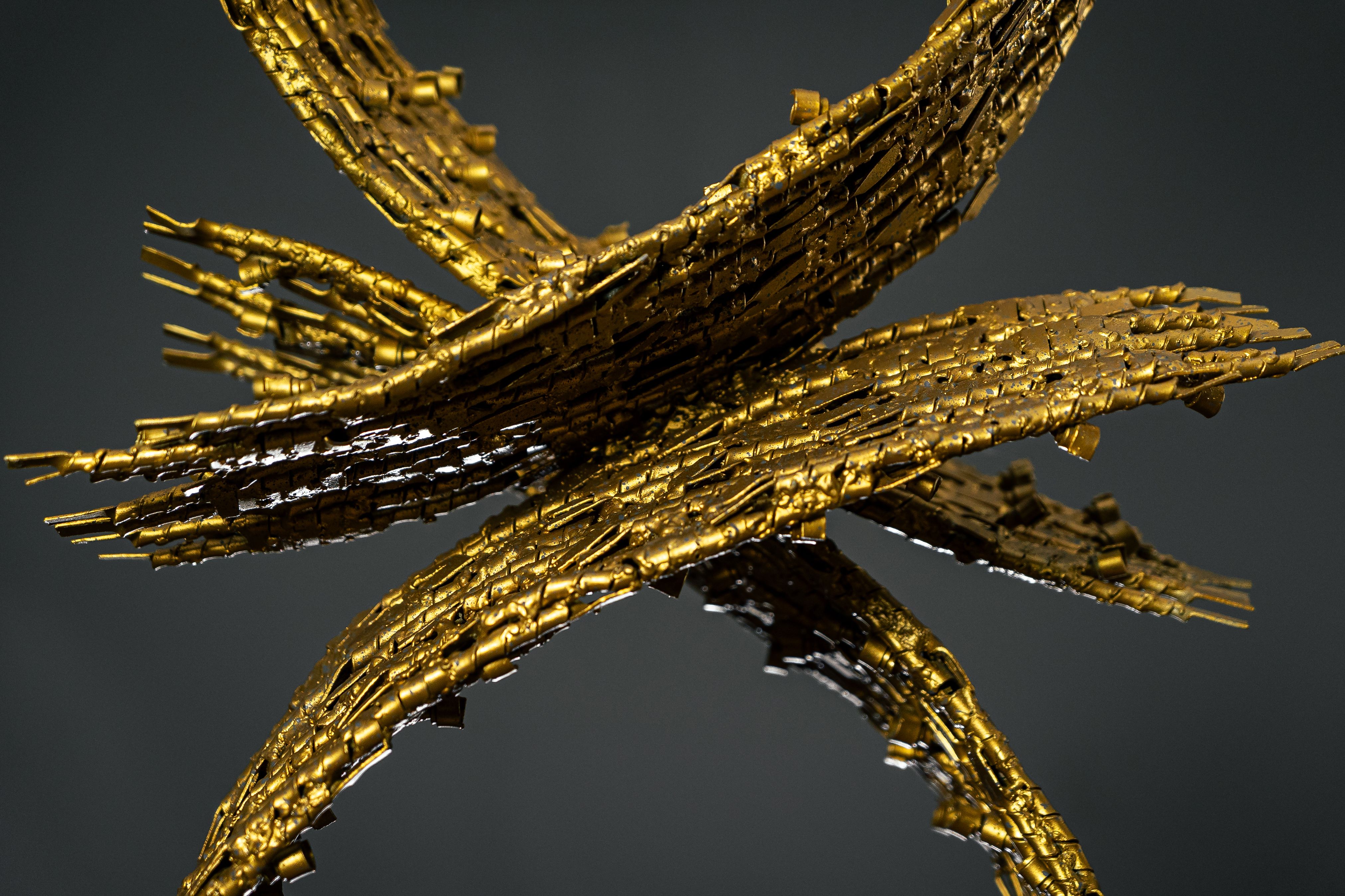 The gold sculpture titled “Eight Series” is a contemporary artwork that represents the power of connection and continuity, crafted from iron shaped into Redy Rahadian’s signature small human-like figures. Hundreds of these figures are interlinked and unified, forming a complete number eight.