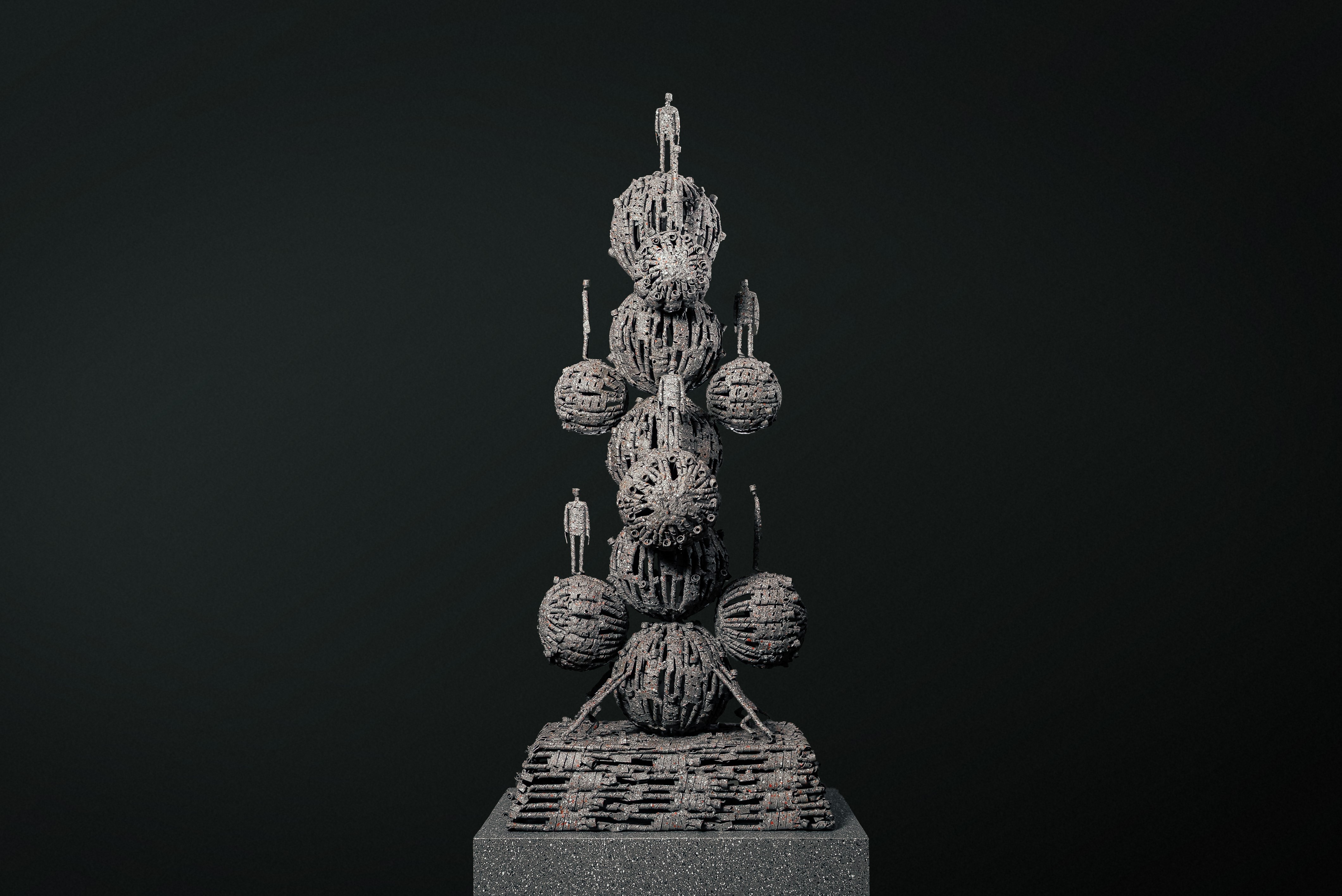 This stack of iron spheres is composed of Redy Rahadian’s signature small human figures interconnected and supporting one another, rising to form a towering structure. At the top, a single figure stands not as a symbol of perfection, but as a representation of process and journey.