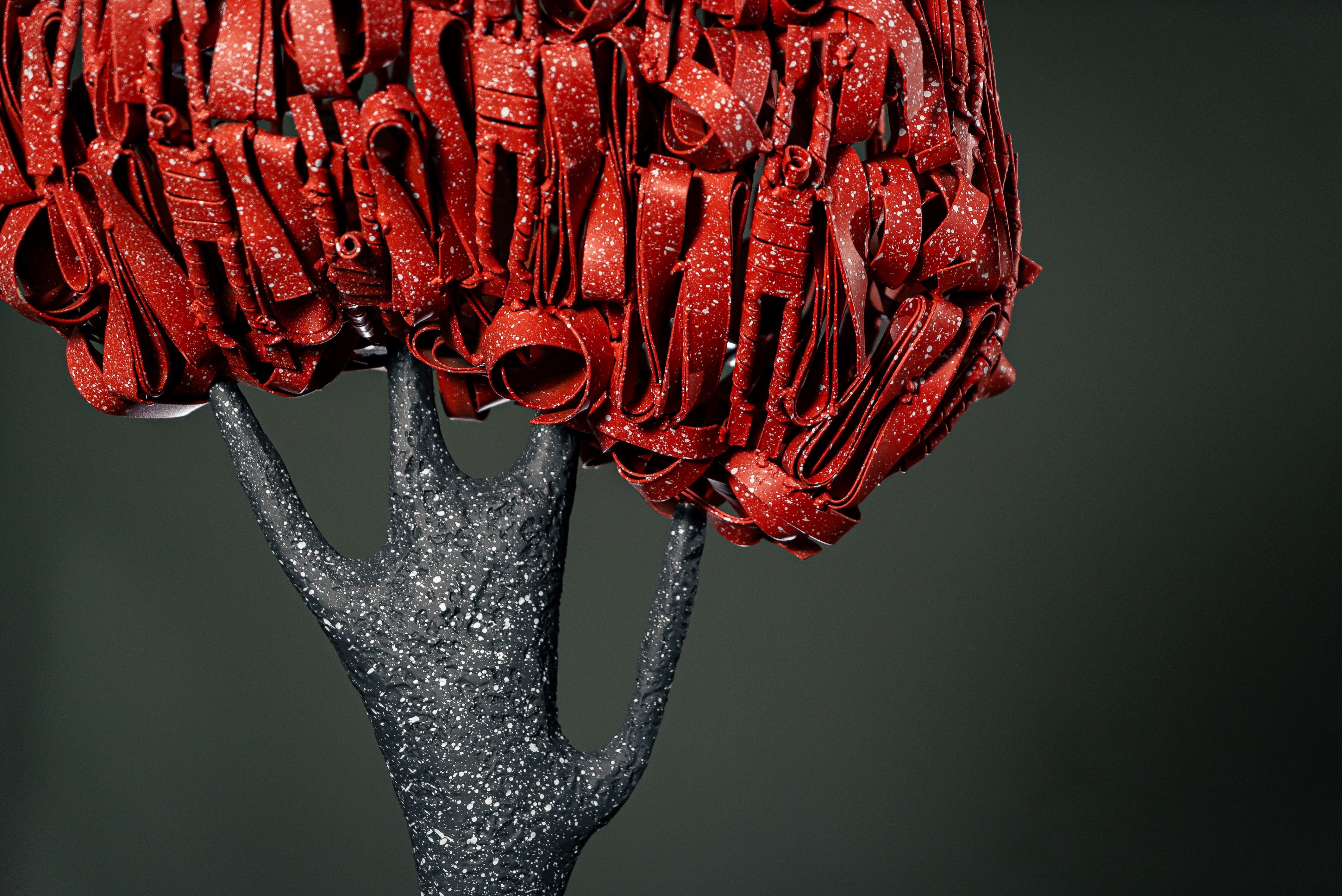 In this work, Redy Rahadian once again showcases his signature style small iron human figures intricately connected to form a single, striking tree-like structure. The tree trunk rises firmly from the base, while the foliage above glows, creating a visually energetic and meaningful contrast.