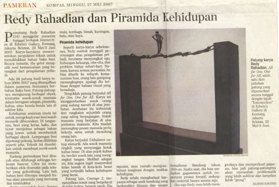 Patung Redy Rahadian (34) menggelar pameran tunggal bertajuk Interarction di Edwin’s Gallery, Kemang, Jakarta Selatan, 22 Mei-3 Juni 2007. Karya-karyanya mencerminkan pergulatan teknis untuk menaklukkan bahan baku besi. Secara tematis, dia getol mengulik soal kemanusiaan yang berangkat dari pengalaman pribadi.